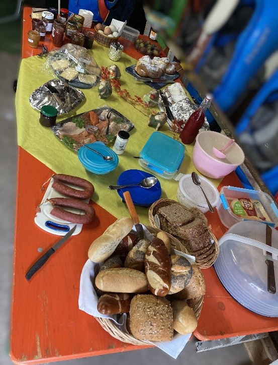 Am Sonntag, den 12. Oktober hatten die Wickinger zum großen Wickinger-Frühstück am Bootshaus eingeladen. Bereits im Vorfeld wurden Absprachen über die mitzubringenden Speisen getroffen und so entstand ein Frühstückbuffet, bei dem es an nichts fehlte (siehe Foto). Nebenbei wurden noch 20 frisch gelegte Eier von hauseigenen Hühnern gespendet.