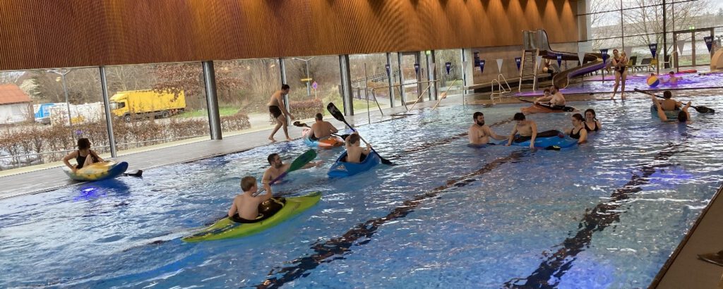 Zu unserer letzten gemeinsamen Veranstaltung im Jahr 2025 trafen sich am Sonntagnachmittag, 07. Dezember, fast 30 Wickinger im Hallenbad in Blankenloch. In den Wintermonaten nutzen wir einmal im Monat das Stutensee-Bad, um mit unseren Anfängern die Grundtechniken des Paddelns und vor allem die Kenterrolle (auch Eskimorolle genannt) zu üben. Insgesamt 8 Kajaks standen vor Ort zur Verfügung und waren bei den Anwesenden Jugendlichen und Kindern „heiß begehrt“. Unter Anleitung unserer Jugendtrainer wurde zunächst der Bewegungsablauf bei der Kenterrolle erklärt und anschließend in der Praxis geübt. Zu Beginn des Trainings muss grundsätzlich noch große Unterstützung geleistet werden, doch im Laufe des Winterhalbjahres werden die Bewegungen routinierter, so dass zu Beginn der Freiluftsaison die Kenterrolle eigenständig beherrscht wird. Neben dem Training im Boot nutzten auch viele Kleinkinder mit ihren Eltern und Großeltern den Termin im Hallenbad zum Schwimmen und Plantschen. Unser nächster Termin im Stutensee-Bad ist der 11. Januar 2026.