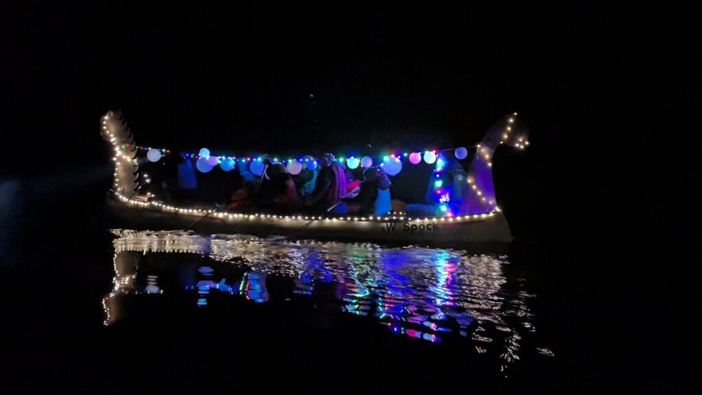 Die beiden Großkanadier waren mit Lampions und Lichterketten geschmückt und am Bootshaus erleuchtete eine Feuertonne die umstehenden Bäume. Nach Ausgabe der Schwimmwesten und Stechpaddel wurden die Paddler auf die beiden Boote verteilt. Die voll beladen Kanadier legten vom Ufer ab und fuhren auf den dunklen Baggersee. Über dem Wasser hatte sich eine dünne Nebelschicht gebildet, die die Stimmung noch etwas unheimlicher machte. Mit kräftigen Paddelschlägen wurde der Baggersee umrundet und teilweise wurde es in den Booten sehr ruhig, um die einmalige Stille und die nächtliche Stimmung dieser Nachtfahrt „aufzusaugen“.
